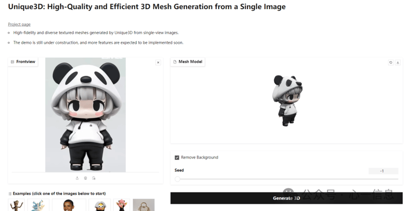 https://u45213-bcf9-ef67553e.westx.seetacloud.com:8443,选择下面对应的图片点击【generate 3D】即可在线生成,因为是Demo界面,现如今还不支持自定义图片的3D生成。