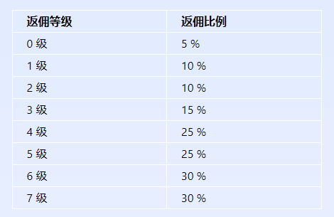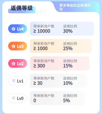 设置了返佣等级,起步返佣5%,最高返佣30%。